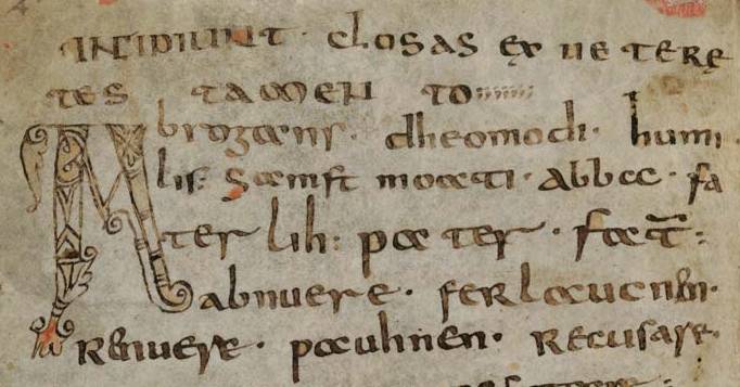 | 4 | Abrogans. dheomodi. humilis: samftmoati. abba. faterlih: pater. fater: abnuere. ferlaucnen. renuere. pauhnen. recusare. faruuazzan: refutare: fartriban. absque uetere. uzzana moatscaffi: absque amicicia. uzzana friuntscaffi: abincruentum. anasceopandi. abinmittentes. analazcende. absit. fer si. longe sit. rumo si. abest. fram ist: deest. uuan ist. abdicat. farchuuidhit. abominat. faruuazzit. denicat. farsahchit. repudat. fartribit. abstruhum. uncafori. clandestinum. |